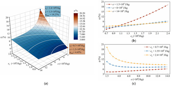 Effect of the chemical specific energy and laser specific energy on the ablation efficiency: (a) ablation efficiency under different values for the chemical specific energy (ec) and laser specific energy (e); (b) ablation efficiency with a fixed value of e; (c) ablation efficiency with a fixed value of ec.