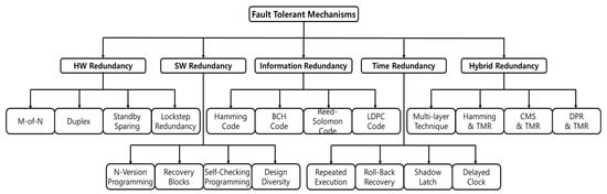 Figure 3 categorizes fault recovery methods in electronic equipment according to their FTM types. Representative FTMs include hardware redundancy, software redundancy, information redundancy, and time redundancy. These are design techniques that employ additional data, hardware, or time to enhance system reliability and constitute a core concept for fault tolerance. Redundancy ensures normal operation or enables error detection and recovery, even when faults occur.