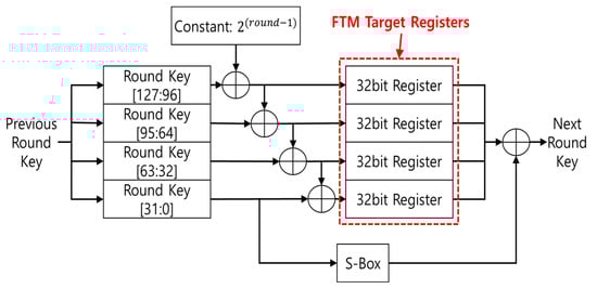 The fault model used in this study consists of transient single-bit stuck-at-0, stuck-at-1, and bit-flip faults. These faults were injected throughout the entire AES-128 security circuit, including the 32-bit registers in the Key Expansion module protected by each FTM.