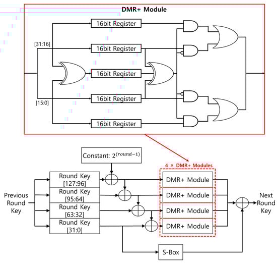 DMR+ is a hardware redundancy-based FTM designed to reduce area usage relative to TMR while maintaining similar delay [46]. The DMR+ circuit uses two sets of duplicated bits as well as parity bits to detect and correct errors. Unlike DMR (which only detects errors), DMR+ can correct them. It also consumes fewer resources than TMR, but it has the drawback of slightly longer delay compared to TMR.