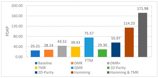 In this study, we reviewed three metrics for evaluating the performance of FTMs: EDP (Energy-Delay Product), EDAP (Energy-Delay-Area Product), and PDAP. EDP reflects energy and delay factors but does not include area information, which can result in a somewhat limited evaluation in terms of hardware redundancy. EDAP is primarily obtained through simulation or mathematical modeling after synthesis, which may impose some limitations when applied at the RTL-stage evaluation [32,33,34,35]. In contrast, PDAP allows us to acquire key parameters—power, delay, and area—at the RTL stage using available support tools [36,37,38,39]. It can provide a more comprehensive performance evaluation for real-time applications, such as FPGA logic circuits. These aspects are presented in Table 1. Consequently, PDAP was adopted as the evaluation metric in this study.