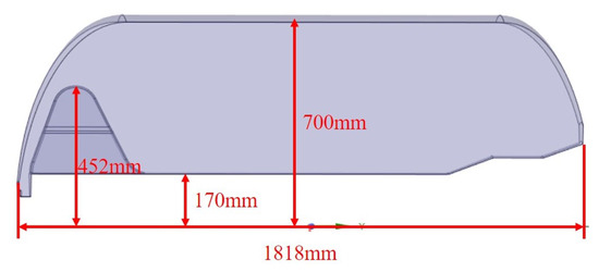 The solid rocket motor is a typical design featuring wing slots. Due to the circumferential symmetry of the motor’s geometry, the central symmetry plane of the wing slot was selected for numerical simulation. Considering the difficulty of extracting the surface features of motor creep deformation under three-dimensional conditions, a two-dimensional model was employed to reduce computational complexity and conserve resources. The total length, including the nozzle, is 2300 mm. The propellant grain length is 1818 mm. The diameter of the propellant column is 1400 mm, with the diameter of the combustion chamber being 340 mm. The distance from the root of the fin slot to the centerline of the combustion chamber is 452 mm. The specific shape and dimensions of the propellant grain model are illustrated in Figure 1. The front section of the propellant column features 12 wing grooves, each separated by an angle of 30 degrees. The igniter is positioned at the front end of the motor, with a total of 12 gas injection ports. These gas injection ports are arranged in 6 groups on the front side of the igniter cone, with an angle of 60 degrees between each group. The diameters of the two types of ports are 12 mm and 14 mm, respectively.
