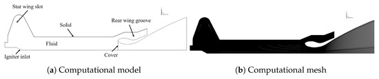 In the initial state, the motor combustion chamber is filled with gases at a temperature of 300 K and atmospheric pressure, which are considered ideal gases. The specific heat at constant pressure is taken as a constant, ignoring the variation in specific heat at constant pressure with temperature. The combustion gases produced by the igniter and the propellant have the same physical properties. Before the ignition of the propellant, the burning surface of the propellant is set as a solid wall. After the wall temperature reaches the ignition temperature threshold, it transfers to a mass-adding wall. During the operation of a solid rocket motor, the advancement of the solid propellant burn surface must be taken into account, and accurately predicting this advancement is crucial for characterizing the motor’s performance [30]. However, in the ignition and pressure-building simulation process, due to the extremely brief duration of the ignition process, the recession of the burning surface is neglected. The calculation parameters for this model are displayed in Table 2.