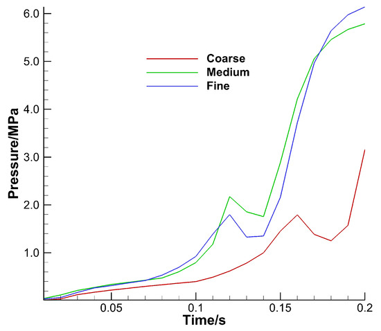 The grid independence test determines the accuracy of numerical simulation. Before officially starting numerical simulation, it is necessary to conduct pre-simulation for grids of different scales to determine grids that can accurately capture flow field information while reducing computational complexity. We conducted grid independence testing research using the grids of different resolutions mentioned earlier. The pressure distribution on monitoring point P6 of the combustion chamber from t = 0 ms to 10 ms is shown in Figure 3. The results show that the pressure distribution at medium and fine grids is nearly consistent. The maximum difference in the pressure distributions between the coarse and medium mesh is 145.6%, while there is only a 2.9% difference between the results of the medium and the fine meshes. In summary, a medium number of grids can balance the degree of computational accuracy and efficiency, achieving precise and efficient calculation of the ignition and pressure building process. Subsequent simulation calculations in this article are based on medium grids.