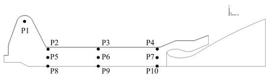 The ignition process of a solid rocket motor with creep is consistent with that of a traditional solid rocket motor and can be divided into three successive stages for analytical purposes: the ignition delay or induction period, the flame propagation period, and the combustion chamber filling period. The ignition delay period usually refers to the time interval between the initiation of the ignition source and the local ignition on the surface of the charge, that is, the first appearance of a flame on the combustion surface of the propellant. The flame propagation period refers to the time interval from the first appearance of a flame on the combustion surface of the propellant to the ignition of the entire propellant, that is, the time required for the flame to propagate from the local ignition point to the entire combustion surface and fully ignite the propellant. The time taken from the end of flame propagation until the combustion products gradually fill the combustion chamber cavity and the equilibrium pressure of the combustion chamber is established is called the combustion chamber filling period. To analyze the numerical results, several probing points are generated in the computational domain to monitor the pressure changes, as shown in Figure 4.