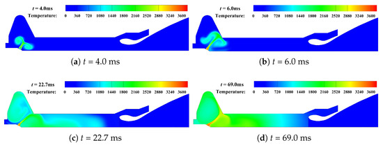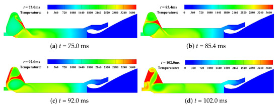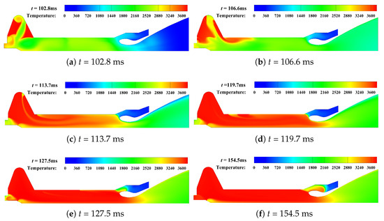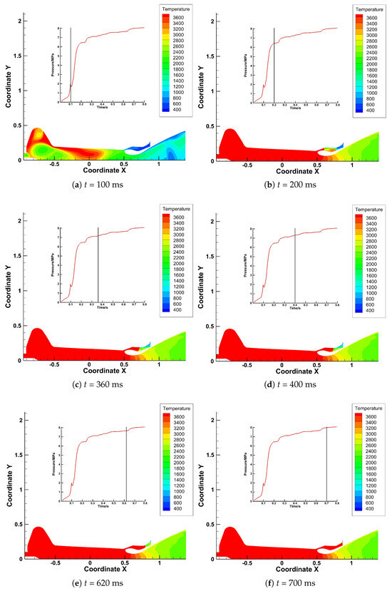 As the surface of the propellant begins to ignite, the ignition process enters the flame propagation period. After igniting the propellant column, the high-temperature gas flows with the vortex in the star-shaped wing groove, gradually igniting the surface of the groove. Another part of the high-temperature gas also flows along the main channel of the combustion chamber towards the side of the combustion chamber nozzle. At the same time, due to the blockage of the airflow caused by the cover, the gas undergoes compression and reflection, resulting in gas reflux and gradually increasing the pressure inside the cover. When the pressure inside the cover reaches the threshold to rupture and open at 102.0 ms, the cover opens, and the combustion chamber is connected to the outside atmosphere, allowing high-temperature and high-pressure gas to flow out of the nozzle quickly. Figure 7 shows the distribution of temperature changes in the combustion chamber from the ignition of the propellant column to the moment before the cover is opened.