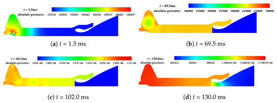 In the numerical simulation process, the initial temperature of all domains is 300 K, the velocity for the x,y-direction is set to 0, and the pressure is 101,325 Pa. The global time step is set to s for all the domains, and when the iteration error is less than , one should exit the inner iteration and proceed to the next time step. The time step is determined by the Courant number, which is defined in Equation (13). According to the formula, represents the distance the fluid travels in time , and dividing this by the grid size indicates how many grid cells the fluid passes through in one time step. Clearly, the more grid cells passed in one time step, the faster the computation, but the poorer the convergence. To ensure convergence, the Courant number is generally chosen to be between 1 and 10. In the previous discussion on grid density selection, once the grid density is determined, the grid size is determined. The time step can then be calculated. Finally, the time step is set as s. The pressure threshold for opening the cover is set to 2.0 MPa. The duration of the ignition gas is 0.2 s.