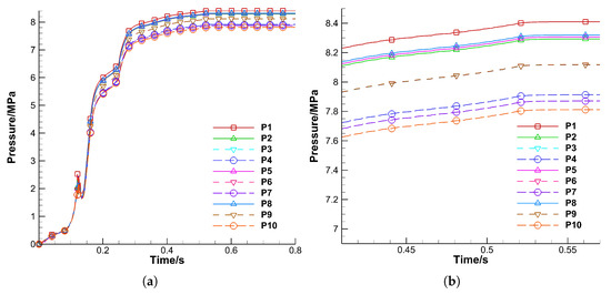 The pressure variation curve of each probing point with ignition time. (a) Pressure versus time curve in the whole time domain. (b) The details of the pressure versus time curve.