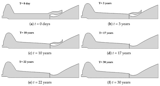 During the long-term vertical storage of a solid rocket motor, the physicochemical properties of the propellant change over time, and due to the long-term effect of the gravity load, the propellant undergoes creep. The direction of gravity loading is along the x-axis. To obtain the shape change of the combustion chamber of the solid rocket motor, structural mechanics simulation was carried out using the composite time hardening creep model mentioned earlier. The simulation results are shown in Figure 11. This study evaluated 32 operating conditions for the solid rocket motor, considering storage durations of 3 days, a range from 1 to 30 years with an interval of 1 year, and scenarios without creep. Figure 11 shows the changes in the propellant creep conditions of the solid rocket surface after storage for 0 days, 3 years, 10 years, 17 years, 22 years, and 30 years. The creep simulation results of the propellant were amplified during post-processing to simulate the ultimate deformation of the propellant. The entire process of propellant creep can be divided into four stages: instantaneous creep, decay creep, steady-state creep, and accelerated creep [23]. By analyzing the time-dependent characteristics of propellant creep, it can be found that propellants undergo significant creep during the solidification and cooling process. As time passes, the creep changes significantly in the early stage and slightly in the middle stage. After exceeding a certain time threshold in the later stage, the physical and chemical properties of the propellant deteriorate, and the creep situation changes sharply. By analyzing and comparing the creep situation at each time point, it can be found that the star-shaped wing groove in the front section of the propellant undergoes backward displacement, and the main channel surface of the combustion chamber collapses towards the center from left to right, with the deformation gradually increasing. The maximum displacement deformation occurs in the rear wing groove of the propellant. As the storage time increases, the propellant in the rear wing slot undergoes deformation until the rear wing slot is completely blocked. This causes the burning surface of the propellant to become smaller, affecting the equilibrium pressure reached during the ignition transient. At the same time, changes in the surface of the propellant combustion chamber can cause changes in the ignition process of the propellant and the flow field characteristics. Next, an analysis will be conducted on solid rocket motors’ ignition and pressure-building process under creep conditions with different storage durations.
