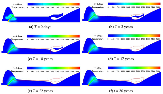 The temperature distribution of the ignition flame reaching the combustion chamber surface of motors with different storage years is shown in Figure 12. Due to the long-term storage of the solid rocket motor, the propellant grains creep, and the front wing slots of the propellant grains deform, gradually causing displacement backward over time. When the ignition gas is injected into the combustion chamber for 6 ms, it almost reaches the surface of the propellant column. However, as the deformation of the propellant grain increases with longer storage time, the ignition gas reaches the surface of the propellant grain slightly later.