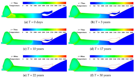 When the pressure on the front side of the cover reaches the threshold for opening the cover, the temperature distribution of the combustion chamber is as shown in Figure 14. By comparing and analyzing the simulation results, it is found that there is a positive correlation between the time the cover is opened and the storage time of the solid rocket motor. The longer the storage time of the solid rocket motor is, the greater the creep of the propellant grains. The area of the front wing of the propellant increases, and the collapse of the rear wing groove gradually blocks the wing groove. The rise in wing surface area at the front end of the propellant column leads to a longer heat transfer time, affecting the time for the combustion chamber pressure to reach the threshold for opening the cover. Due to changes in the overall area of the combustion chamber, the equilibrium pressure achieved by the motor after ignition is affected, thereby influencing the motor’s performance parameters and health indicators. Meanwhile, by monitoring the ignition time of the front wing slot, it is seen in Table 3 that the ignition time gradually extends with the increase in storage duration. This is because the ignition area of the front wing slot becomes more significant under prolonged gravitational effects, resulting in a longer time for the propellant to heat up to the ignition temperature.