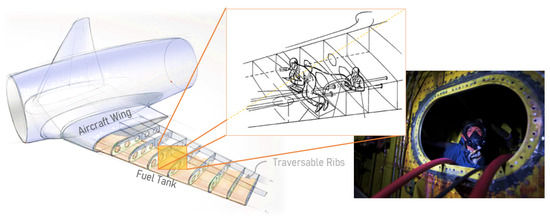In the aviation industry, the regulatory institutions state specific requirements in order to provide high-quality products and services for the certification of airplanes. One example is the CS-25.993 specification [6], which states procedures for fuel tank systems, covering visual inspections, leak detection tests, and Non-Destructive Testing (NDT) methods to maintain fuel tank integrity and airworthiness. To comply with these requirements, qualified personnel are typically required to enter a confined space and navigate through the fuel chamber compartments (see Figure 1) as explained in the MPD [1]. In this scenario, using respiratory and personal protective equipment (PPE) is necessary, especially for larger aircraft structures. The personnel must then take high-quality photos, and identify and categorize various types of damage, similar to the ontological taxonomy described in [7].