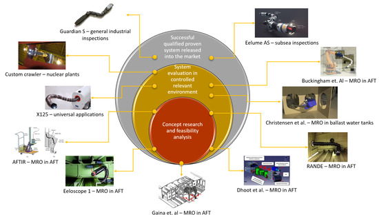Significant innovative robotic research has been accomplished over the past decade, the main focus being on external aircraft NDT. However, the interest in internal inspections has also been growing considerably [3]. In ref. [3], robotic inspection systems across various domains are explored, including aviation, underwater applications, shipping, the oil industry, and nuclear power plants—the latter covering research spanning 20 years [21]. Figure 2 illustrates the diverse mechanisms implemented in these contexts, which have been simulated or tested under certain environmental conditions.