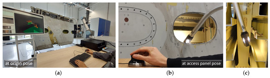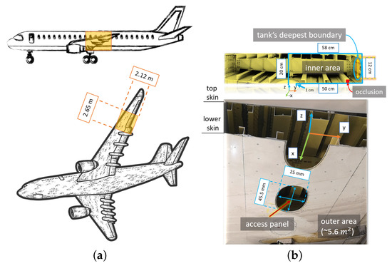 To clarify the workspace perspective, Figure 3a presents two side-view images of the aircraft and Figure 3b two images highlighting the outer and inner wing sections. The goal is to perform visual inspections entering from the access panel all the way through the inner area until the tank’s deepest boundary is reached.