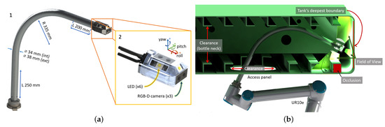 The clearance (see Figure 4b) is the minimum unobstructed distance required for Eeloscope 2 to reach the tank’s deepest boundary. This distance must account for the access panel dimensions (minimum 25 cm) and the bottleneck space (12 cm), which serve as the constraints for the mechanical design.