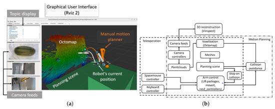 Figure 5. Overview of main components and their integration with the human operator. (a) RViz 2 shows real-time camera feeds, a height-based color gradient (Octomap) and other visual components. (b) Scheme of main software functions and components highlighting both operating modes.