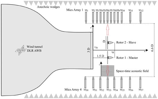 Sketch of the experimental setup employed and the layout of the linear microphone arrays analyzed.