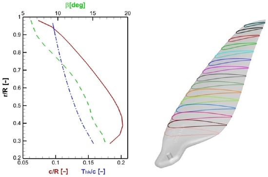 Blade characteristics: the radial distribution of the chord (red line), thickness (blue dash–dot line), and blade pitch b (green dashed line) (left); isometric view of the blade and airfoils highlighted with colors (right).
