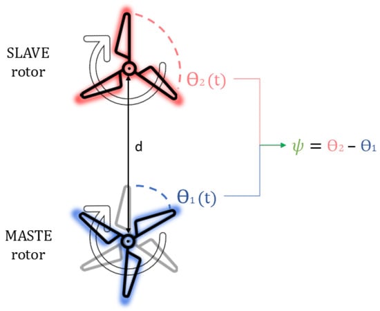 Graphical representation of the phase shift between propellers, , defined as the sum of the absolute positions for the master propeller and for the slave propeller.