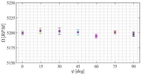 Hereafter, the results obtained from the performance qualification campaign for the phase control system are shown and discussed. The standard deviation of the phase delay, reported as a horizontal error bar in Figure 5, is very small, highlighting the good stability of the controller. In the same figure, the standard deviations of the rotational speed of the two propellers are represented as vertical error bars. It is worth noting that only minor variations in the rotational speed are required to maintain a stable phase shift between the two propellers. This indicates that the test cases can be considered to operate at a constant rotational speed. Additionally, using two markers (a red dot for the master propeller and a blue circle for the slave propeller), the mean rotational speed values for both rotors were plotted, showing a perfect overlap between the two markers. Finally, the mean rotational speed values upon , for the seven different test cases, remain fairly constant around the nominal angular velocity. Hence, it can be concluded that the performance of the synchronization system is quite satisfactory. This graph refers to a rotational speed of 5200 RPM, with a wind tunnel flow velocity of 10 m/s. Each color refers to a different test.