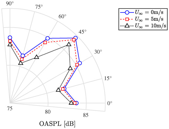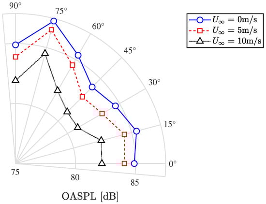 It is worth noting that a phase shift of 75° produces constructive interference at microphone 6 and destructive interference at microphone 33. This interference phenomenon significantly influences the polar distribution of the noise, impacting the noise’s directivity. In contrast, the noise directivity for an isolated rotor would be symmetrical. The most critical aspect of this noise mitigation technique is that acoustic mitigation can only be achieved within specific, limited areas using two rotors. To highlight the effect of the inflow velocity on the noise interference, two phase delays were selected to focus the following data analysis, 45° and 75°, corresponding to the minimum/maximum OASPL observed in Figure 6 and Figure 7. In Figure 8, the OASPL for 45° and 75° appears to be evenly spaced, showing that the effect of speed on constructive or destructive interference is similar; therefore, the flow velocity reduces the aerodynamic load in the same way for the two different interferences. Indeed, for constructive interference, the noise generated by the two rotors is spatially combined. Conversely, destructive interference should cancel out the noise generated by the propellers regardless of the inflow velocity.