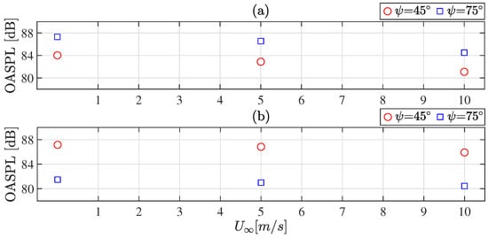In Figure 6, the Overall Sound Pressure Level (OASPL) for microphone 6 is shown, with variations in the inflow velocity and rotor phase delay; the frequency limits used for the OASPL calculation correspond to those imposed by the applied digital filter, with Hz and Hz. In this figure, two OASPL maxima occur at 15° and 75°, with a minimum at 45°.