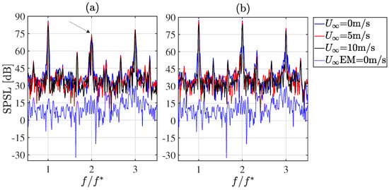 To explain this behavior, the Sound Pressure Spectral Levels (SPSLs) related to microphone 6 for the different inflow velocities are calculated and reported in Figure 9; the resolution used for the spectra shown is = 1 Hz.