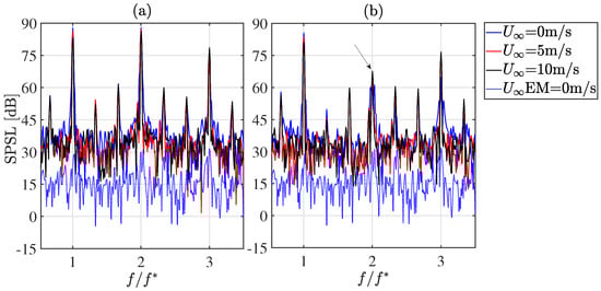 Destructive and constructive interference only affect the second harmonic in all cases, maintaining independence from the free-stream velocity. This phenomenon is particularly interesting because the interference being limited to the second harmonic is not immediately intuitive. The blue dashed line in both Figure 9 and Figure 10 represents the acoustic spectrum of both motors in a side-by-side configuration without the propeller, clearly highlighting the difference in noise emissions.