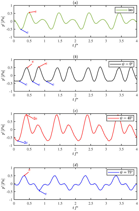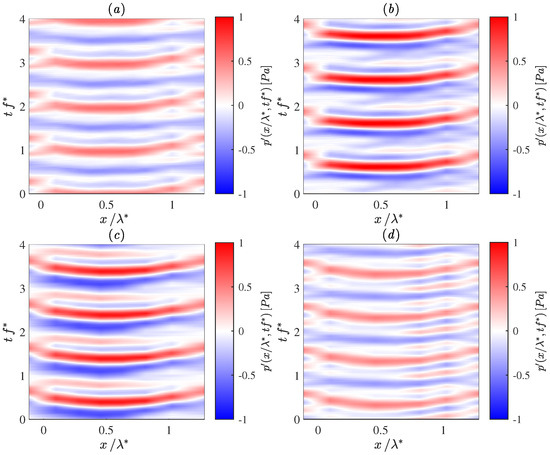 Space–time pressure fluctuations measured using microphone array 1 for 45° (a) and 75° (b) and using microphone array 4 for 45° (c) and 75° (d).