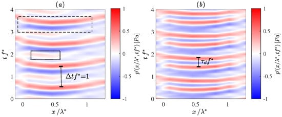 The space–time pressure fluctuations measured using microphone array 4 for an isolated rotor (a) and a side-by-side, perfectly synchronized rotor ( 0°) (b).