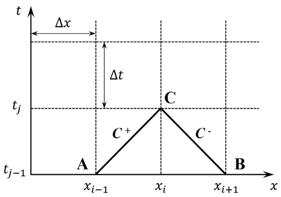 and in Equation (11) contain information from the previous step. These expressions include variables such as the flow rate, specific quantity, and friction coefficient, with representing point A and representing point B. incorporates physical properties such as pipe characteristics, wave speed, and gravitational acceleration. Both equations are computed along the and lines shown in Figure 1, representing characteristic lines. The magnitude of the slope of each line corresponds to the wave speed a, indicating the propagation of disturbances in a physical sense. For instance, if a disturbance occurs at point A, it propagates along the line and reaches point C after a time interval .