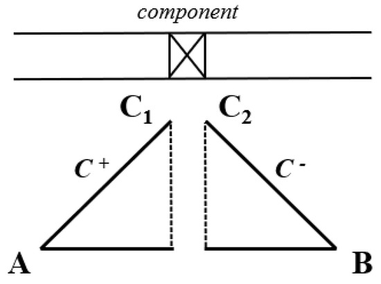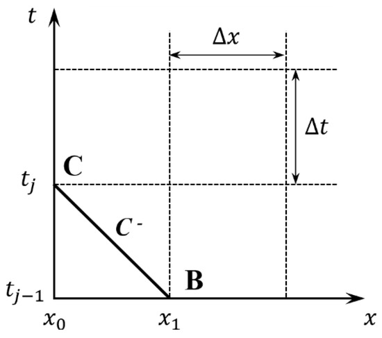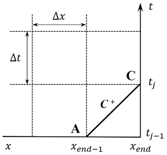 The first category involves the inlet and outlet points of the system, denoted as the starting point and end point , respectively. At these locations, the value at the current step is calculated based on the values from the previous step and the or lines. Figure 2 and Figure 3 illustrate the boundaries at the inlet and outlet points, respectively. In the inlet condition, the value of point C is derived considering point B and the line, while that in the outlet condition is derived considering point A and the line.
