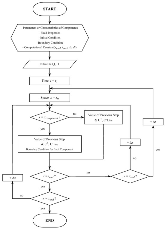 The in-house code is implemented using MATLAB R2023a (MathWorks) and executed on a computer with the specifications outlined in Table 1. The system configuration matches the experimental equipment described in Section 3, and the process flow diagram is shown in Figure 5. The system configuration matches the experimental equipment described in Section 3, with detailed specifications also provided. The pressure and flow rate are determined at each step by using the component specifications, fluid properties, boundary conditions, and initial conditions as the inputs. As the fluid used is water at ambient temperature, relevant properties such as density, bulk modulus, and speed of sound are applied. Since the fluid is unpressurized, this condition is reflected in the boundary settings. Values are determined for the initial conditions based on the steady-state results discussed in Section 4. The code checks whether the current x-coordinate corresponds to a boundary condition. If so, it performs calculations using the following steps: (Here, represents the component boundary, where values are determined to align with previously defined boundary conditions by simultaneously solving the modeling equations of each element and the MOC equation (Equation (11).) For the pump, the values of , , and obtained through experiments (Section 3) are substituted into Equation (12), along with values from the previous step to calculate the flow rate and pressure. Similarly, the experimentally derived for the value is inserted into Equation (13) to compute the flow rate and pressure. In contrast, if the -coordinate is within the pipe, the pressure and flow rate are calculated using Equation (11) and values from the previous time step. Iterations for and are performed, and the simulation is terminated when t reaches the defined simulation endpoint, at .