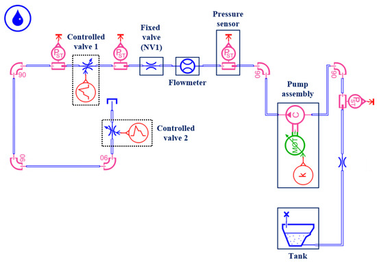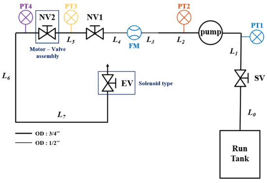 To measure the differential pressure across each component, pressure sensors (PT1–PT4) were installed at the inlet and outlet of each component. The pressure measurement locations are indicated in Figure 8. Measurements of pressure are taken at the pump inlet (PT1), pump outlet (PT2), NV2 inlet (PT3), and needle NV2 outlet (PT4). The sensors used are the “PSH” series from Sensys, with an accuracy of 0.15%. Additionally, a flowmeter is installed in the pipe (FM1) connected to the pump outlet to measure the system flow rate. The flowmeter used is the turbine-type model “FT–10” from FTI Flow Technology, with an accuracy of 0.05%. To prevent data distortion, the data were sampled at 10 kHz using a National Instruments (NI) DAQ (USB-6216).
