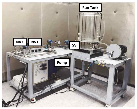 Figure 7 shows the configuration of the water supply experimental equipment. Water serves as the working fluid and is contained in the run tank, with a radius of 0.25 m and a height of 0.6 m. The tank is initially filled with fluid to a level of 0.4 m, and since there is no pressurizing gas, the fluid is maintained at 1 bar within the tank. The supply line, through which the fluid flows, is a 3/4-in steel pipe connected to the tank with a valve (SV) for fluid control. A portion of the supply line is a 1/2-in steel pipe, designed to facilitate the installation of a flowmeter. The detailed specifications of the experimental equipment can be found in Figure 8 and Table 4. The pump for pressurizing the fluid is installed after the SV. The pump is represented using the CY-4281-MK model from SPECK, with a rated rotation speed of 3400 rpm.