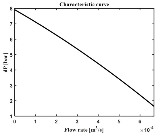The pump supplies propellant to the combustion chamber based on the required flow rate and pressure. The flow rate and pressure of the propellant needed to satisfy the engine thrust requirements are derived as fundamental conditions, and the pump is designed accordingly. The performance curve of the pump (Equation (6)) represents the relationship between the flow rate and pressure changes before and after the pump at a constant speed, as a quadratic equation. This is based on the theory that the square of the flow rate is proportional to the pressure, according to the Affinity law. The coefficients and are determined by the pump performance characteristics. For example, by interpolating the flow rate and pressure data obtained from the experiment using a quadratic equation, and can be determined.