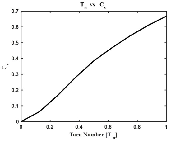 The type of valve selected for the engine depends on its purpose. For simple on/off functionality, solenoid valves or latch valves are used, while for flow control purposes, valves with adjustable flow areas (such as ball valves) are employed. Valves can be modeled considering the flow rate and pressure difference before and after the valve using the flow coefficient [33]. Equation (7) represents the flow through the valve in terms of the flow coefficient (), the specific gravity of the fluid (), and the pressure drop across the valve, obtained experimentally. The flow coefficient is typically used to characterize the valve performance, representing the water flow rate (in gallons per minute) at 60 °F with a pressure drop of 1 psi across the valve. Therefore, a larger flow coefficient under the same pressure conditions indicates a higher flow rate.