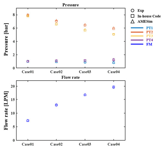 The final validation and performance analysis of the in-house code is conducted through interpretation using the outcomes of experiments and AMESim. Specifically, the results obtained from experiments, AMESim, and the in-house code for pressures (PT1–PT4) and flow rate (FM1) are graphically compared. Due to the slow response time of the flowmeter posing challenges for capturing the oscillation phenomenon occurring in the transient state (rapid mode), the comparison for the flow rate is disregarded. First, by sequentially comparing the results of each experiment, the validity of the in-house code and AMESim simulation is demonstrated. Finally, the accuracy and performance of the in-house code are evaluated by comparing the errors and computation time against the experimental outcomes.