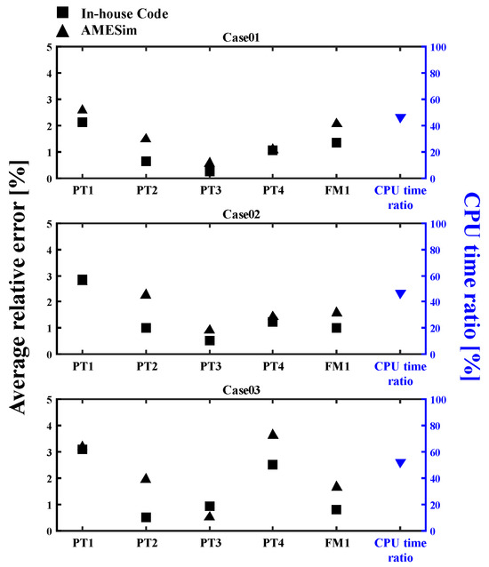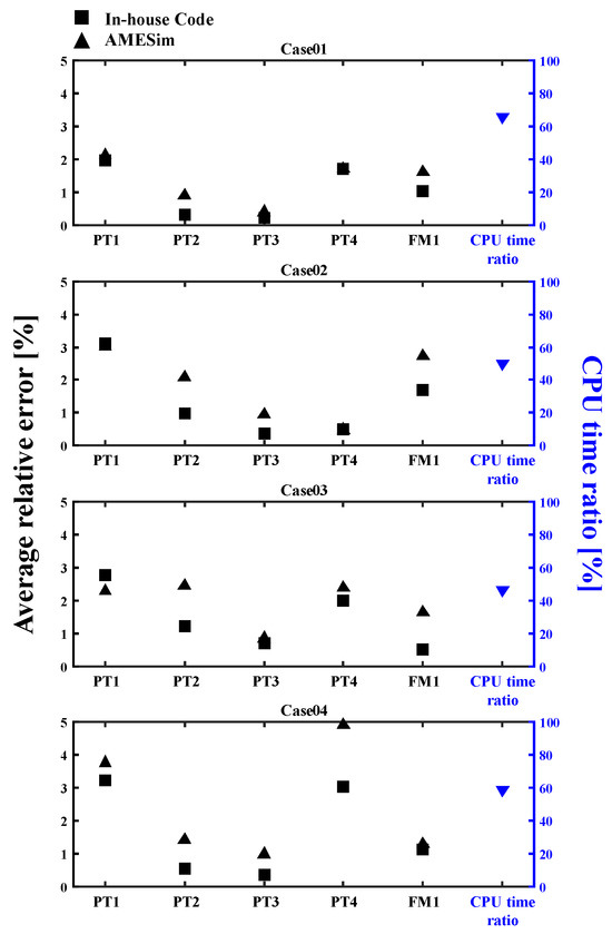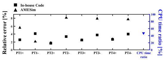 For each of the three experiments, the average relative errors compared with the experimental values for PT1–PT4 and FM1 and the simulation runtime in terms of CPU time are graphically presented. In the case of the transient state (rapid mode), relative errors are calculated for the points with the maximum (+peak) and minimum (−peak) pressures during the initial period. Figure 14, Figure 15 and Figure 16 show the values for the steady state, transient state (slow mode), and transient state (rapid mode), respectively. The square and triangle markers represent the values of the in-house code and commercial software. The inverted triangle markers represent the CPU time ratios of the in-house code to AMESim, depicting the reduction rate in the CPU time of the in-house code relative to the commercial program. The left and right axes represent relative error and CPU time ratios, respectively.