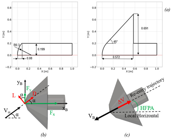 The re-entry of bodies from space has been of great interest to many researchers in recent decades [3,4,5,6]. A distinction can be made between controlled de-orbiting missions, in which the body is de-orbited and re-enters space at a point on the Earth’s surface, and uncontrolled de-orbiting missions, in which one is not interested in recovering the satellite at a specific point (or rather, one ensures that it is destroyed in contact with the atmosphere during descent). To recover the re-entering satellite intact, possible systems to reduce the aerothermodynamic loads acting on the body during descent can be broadly classified as deployable systems, which include both rigid and inflatable configurations [7,8,9]. Deployable systems, having been extensively studied [4,5,6] and recently tested [10], have demonstrated their ability to ensure the safe and controlled reentry of spacecraft. Inflatable systems, as a subset of deployable systems, rely on inflation mechanisms to achieve their operational configuration. In contrast, inflatable systems may present risks of air leaks or malfunctions during deployment or use, potentially making them less reliable under certain circumstances [11,12]. These distinctions highlight the need for careful consideration of mission requirements when selecting rigid or inflatable deployable systems to balance reliability and performance.
