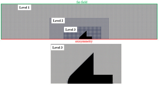 To determine the aerodynamic characteristics of the satellite in the rarefied flow regime, the domain shown in Figure 2 was considered, extending 12 m in the direction of velocity and 3 m in the perpendicular direction. The geometry is axisymmetric, and far-field conditions were set using data provided by [28], as shown in Table 2, based on the MSISE-90 atmospheric model, which is included by default in the GMAT library. The mean free path of the asymptotic flow, λ∞, was calculated using Equation (1), where the reference diameter is the mass-weighted average of the diameters of the individual species, R is the gas constant, kB is the Boltzmann constant, NA is Avogadro’s number, and N∞ is the number density of the free stream. The mesh used for the 2D axisymmetric simulations to determine the CD vs. Altitude profile consists of three levels: level 1 with cell sizes of approximately 8 cm, level 2 with cell sizes of approximately 4 cm, and level 3 with cell sizes of approximately 2 cm. Additionally, a wall refinement is implemented with cells of approximately 1 cm in size.