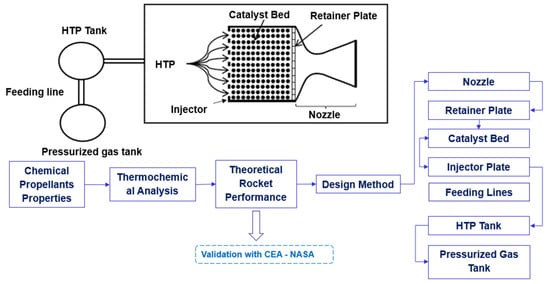 A computational tool was developed to simulate the thermochemical performance of high-concentration hydrogen peroxide (HTP) monopropellant rockets and recommend optimal thruster sizes. The model, based on thermodynamic principles and conservation laws, ensures scalability beyond the validated range and operates independently of external software like NASA CEA [36]. It calculates theoretical performance by assuming stoichiometric dissociation of hydrogen peroxide and adiabatic energy transfer to propulsion [37]. The tool was validated for HTP concentrations between 70% and 98%, showing results consistent with NASA CEA simulations. These findings demonstrate the tool’s reliability for predicting rocket performance.