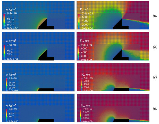 Density contours (left) and velocity contours (right) for the satellite are shown in the deployed configuration at 300 km (a) and 120 km (b) altitudes, as well as in the folded configuration at 300 km (c) and 120 km (d) altitudes.