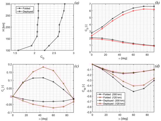 Aerodynamic Study Results: The variation of CD with altitude for zero angle of attack (a), the variation of CD with α (b), CL with α (c), and CM with α (d) in both configurations at altitudes of 120 km and 300 km (deployed: xcg = 0.34 m, ycg = 0, zcg = 0; folded: xcg = 0.5 m, ycg = 0, zcg = 0).