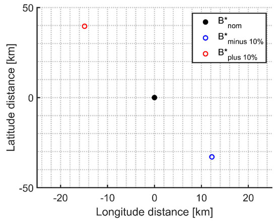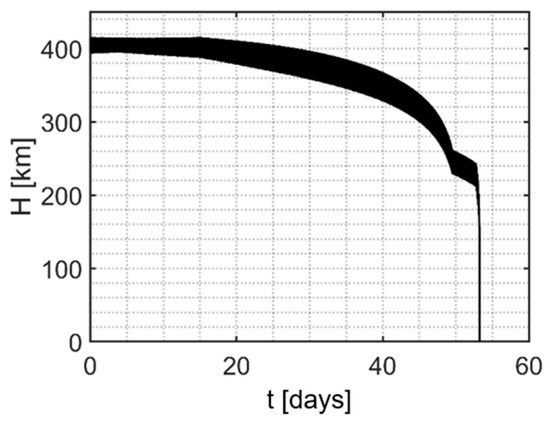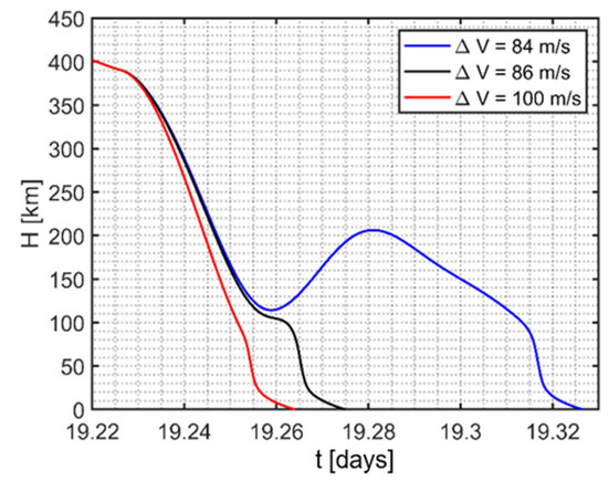The GMAT software can be used to calculate the ∆V required for a satellite to reach the reentry interface, which is typically set at an altitude range of 100–125 km. In this case, an impulsive ∆V of 86 m/s is sufficient for the satellite to successfully reenter. For lower values, the satellite does not immediately penetrate the atmosphere; instead, it reaches an altitude of 115 km, which then slightly increases. However, thanks to aerodynamic drag, it still achieves a point on the Earth’s surface. Figure 7 illustrates this process.