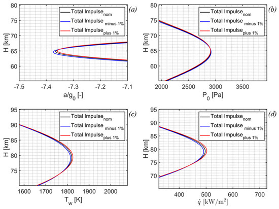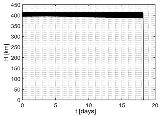 Choosing a value for the thrust, calculated by the total impulse with RPA, the propellant mass flow rate is determined, and, from the effective exhaust velocity, it is possible to calculate the burning time by combining Equations (7) and (8). For the given data, to obtain a mean change in velocity of about 100 m/s, a total impulse of 3100 Ns was applied, with roughly 2.1 kg propellant consumption. Table 5 compares the effects of applying a thrust of 25 N, 50 N, or 100 N for the same total impulse. At an altitude of 100 km, the HFPA consistently measures 0.8 degrees. However, there is a dispersion upon landing that is presumably related to the variation in the satellite position during the burning time (summarized in Table 5). For this study, an intermediate scenario was chosen so that the burn would not last too long (25 N for 124 s would require the system to operate at a temperature of 1000 K) and the thrust value would not be too high (100 N, if not acting along the center of mass, could lead to moments that the inertial wheels could not balance). Assuming that the satellite has wheels of compatible size for inertia and balancing moments in the order of tenths of Newtons x meters, a 1 mm misalignment of the thrust axis from the barycentric axis in any direction would result in 0.025 Nm, 0.050 Nm, and 0.1 Nm of torque, respectively, for 25 N, 50 N, and 100 N. Supposing that 0.3 Nm can be balanced, it is observed that the maximum allowable misalignment decreases from 12 mm at 25 N thrust, to 6 mm at 50 N, and to 3 mm at 100 N. At this pre-design stage, to maintain a maximum misalignment requirement of at least 5 mm and not to expose the satellite structure to high temperatures for too long (excluding the burn time of 124 s), a thrust value of 50 N for an operating time of 62 s is chosen as a compromise. Figure 8 shows the altitude versus time profile in the nominal case.