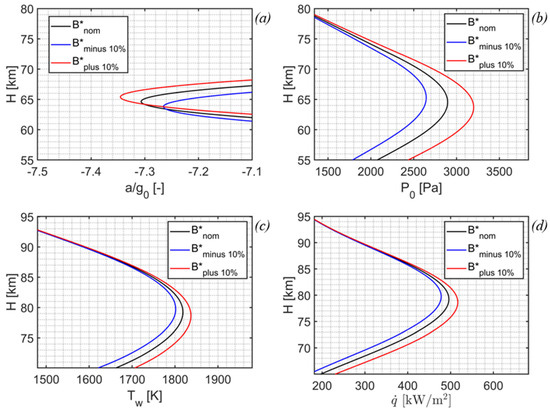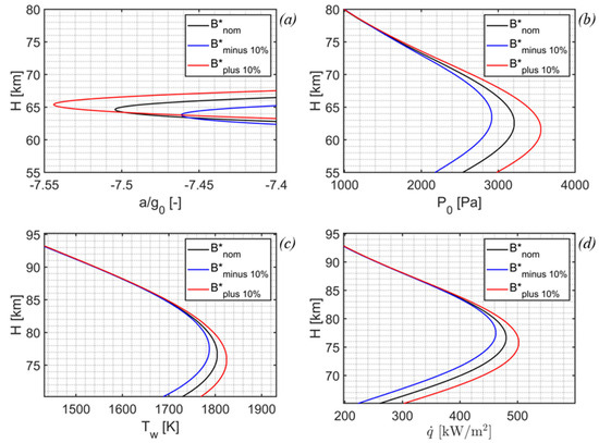 The radiative equilibrium temperature profile corresponding to the convective heat flux computed at the stagnation-point can be calculated by solving, with respect to the wall temperature Tw, the quartic Equation (5). The equation has been solved by means of Newton’s method, with cp being the specific heat (equal to 1000 J/kg K in this work), σ being the Stefan-Boltzmann constant, and ε being the surface emissivity. For the radiative equilibrium temperature calculation (Equation (5)), it is assumed that the surface behaves as a gray body, with constant emissivity (equal to 0.8) and neglecting transmission effects. The calculation is constrained to radiative equilibrium conditions, excluding thermal conduction and transient effects, and the wall is assumed as fully catalytic.
