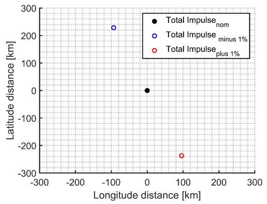 In this work, a finite burn with a monopropellant engine is planned. Specific impulse in vacuum can be calculated as 150 s by considering hydrogen peroxide (wt% 91), under preliminary assumptions, using CEA [36] and assuming an overall efficiency of 90%, an Expansion Ratio of 15, and a chamber pressure of 10 bar. In Table 4, a summary of data is shown. If a thruster capable of providing a thrust of 50 N is assumed, the flow rate can be calculated using Equation (6) and is equal to 33.98 g/s.