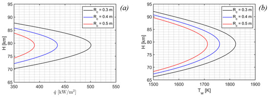The Equation (4) represents the Tauber’s formula, where ρ is the atmospheric density, Rc the curvature radius of the nose, and V is the flight speed. In Tauber’s formulation (Equation (5)), the heat flux is calculated under the assumptions of steady hypersonic flow, treating the body as moving within a continuum regime and neglecting significant radiative effects.