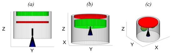 As demonstrated in [29], the selection of the Gas Surface Interaction model and the associated accommodation coefficient are paramount for precise force prediction. To simulate the interaction between the flow particles and the wall, the Maxwellian model is employed, with a fully diffuse reflection obtained setting the accommodation coefficient (defined in Equation (2)) to 1. In Equation (2), the Ei represents the kinetic energy of the incident particle, Er denotes the energy of the re-emitted particle, and Ew signifies the energy the particle needs to deplete to reach thermal equilibrium with the wall [30,31]. The wall is isothermal at a temperature of 300 K, and any incident particle fully accommodates to the wall before being re-emitted.